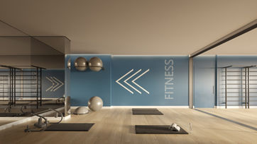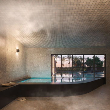 • Piscina com deck, molhado e seco, integrada a uma sauna com parede em vidro.